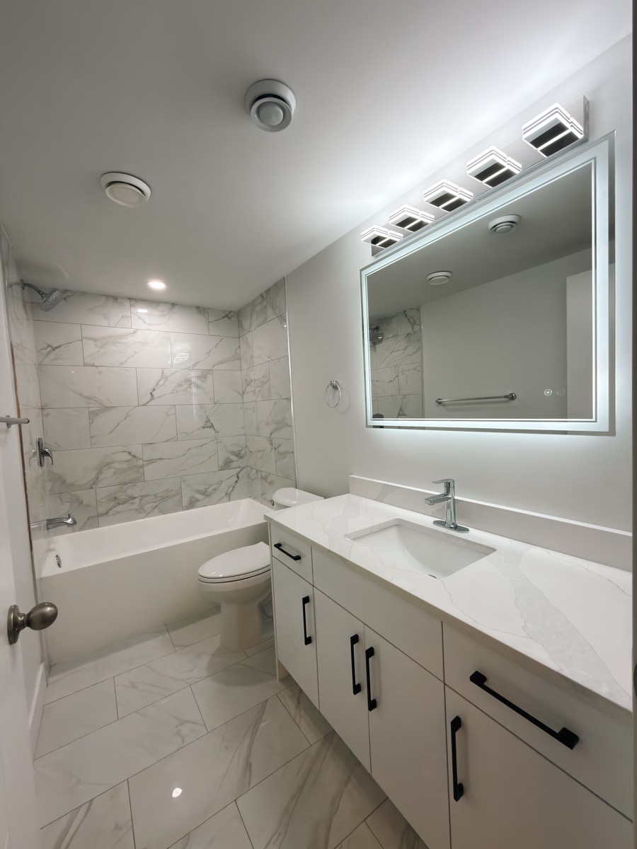 The bathroom got marble tile throughout the shower surround, a white acrylic tub/shower combo, and recessed LED lighting. Tile work is one of those details that separates a basement suite that rents fast from one that sits empty.