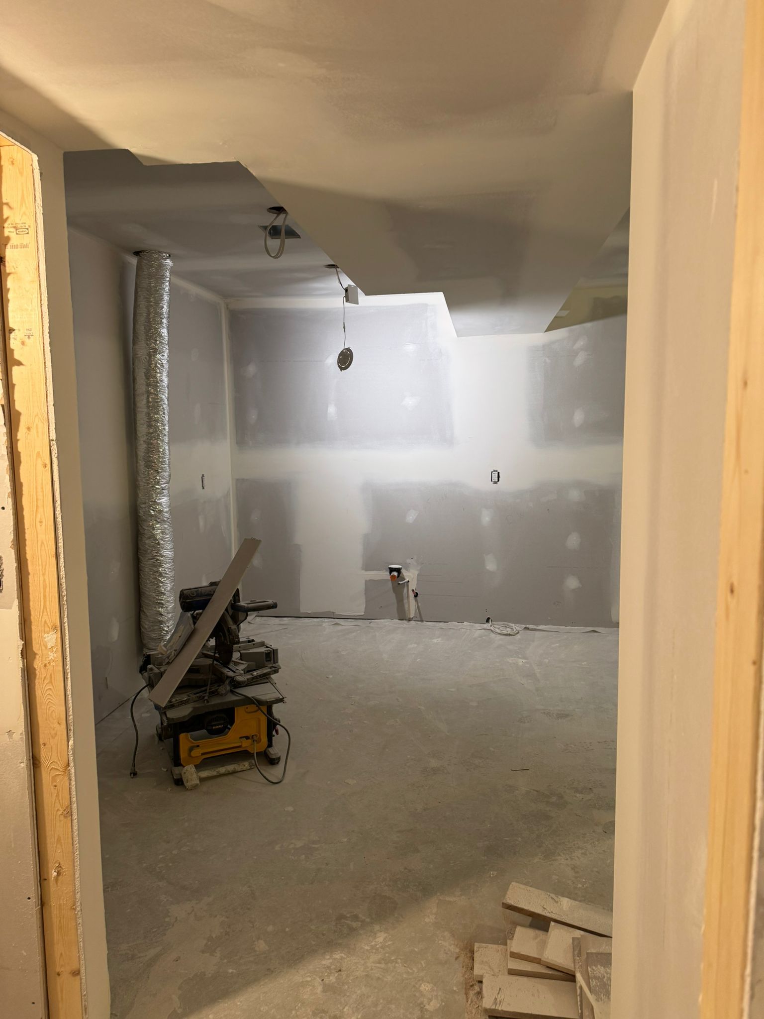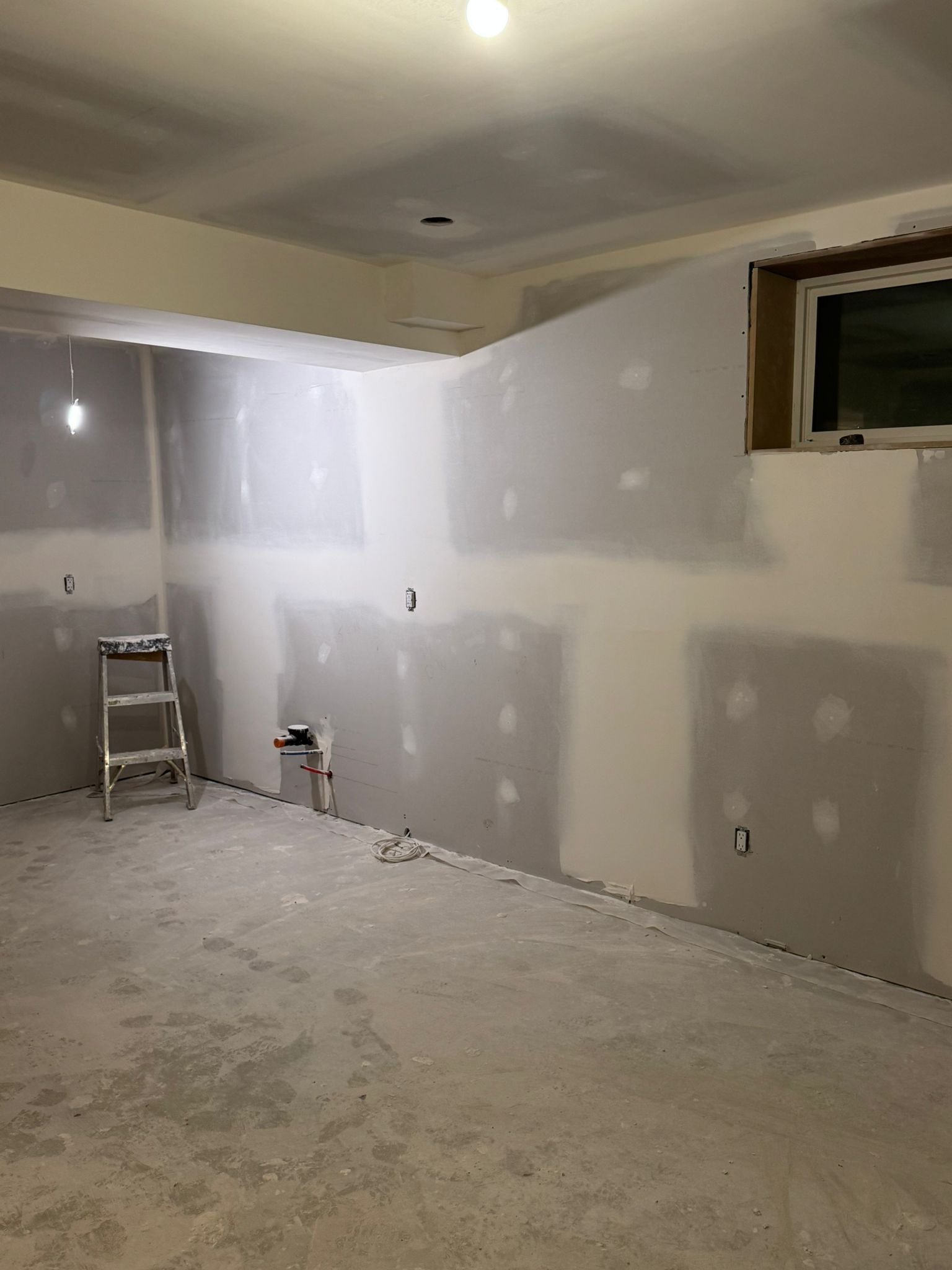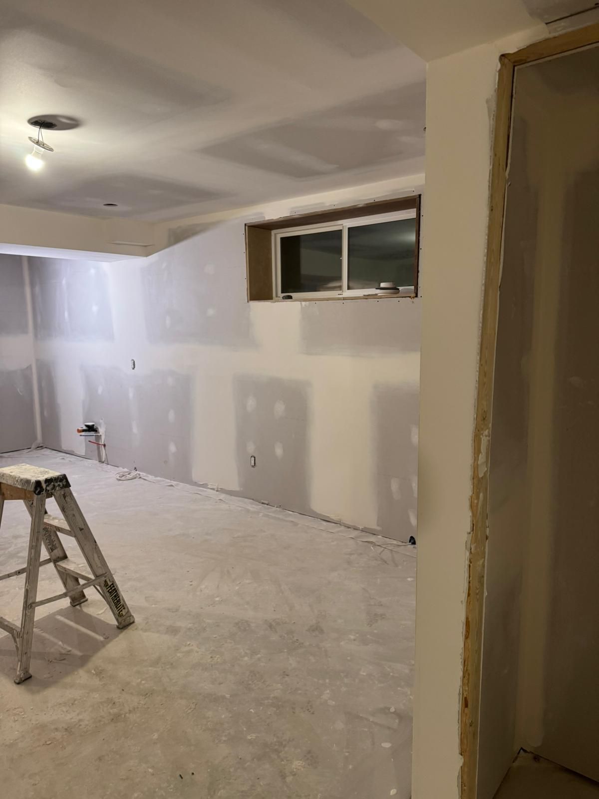 Once framing passed inspection and all rough-ins were complete, drywall went up throughout the suite. Walls were taped, mudded, and sanded smooth. Recessed lighting was installed in every room. The stairwell for the separate entrance also took shape during this phase.
