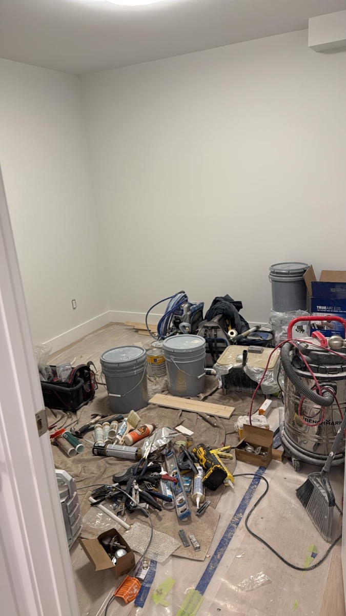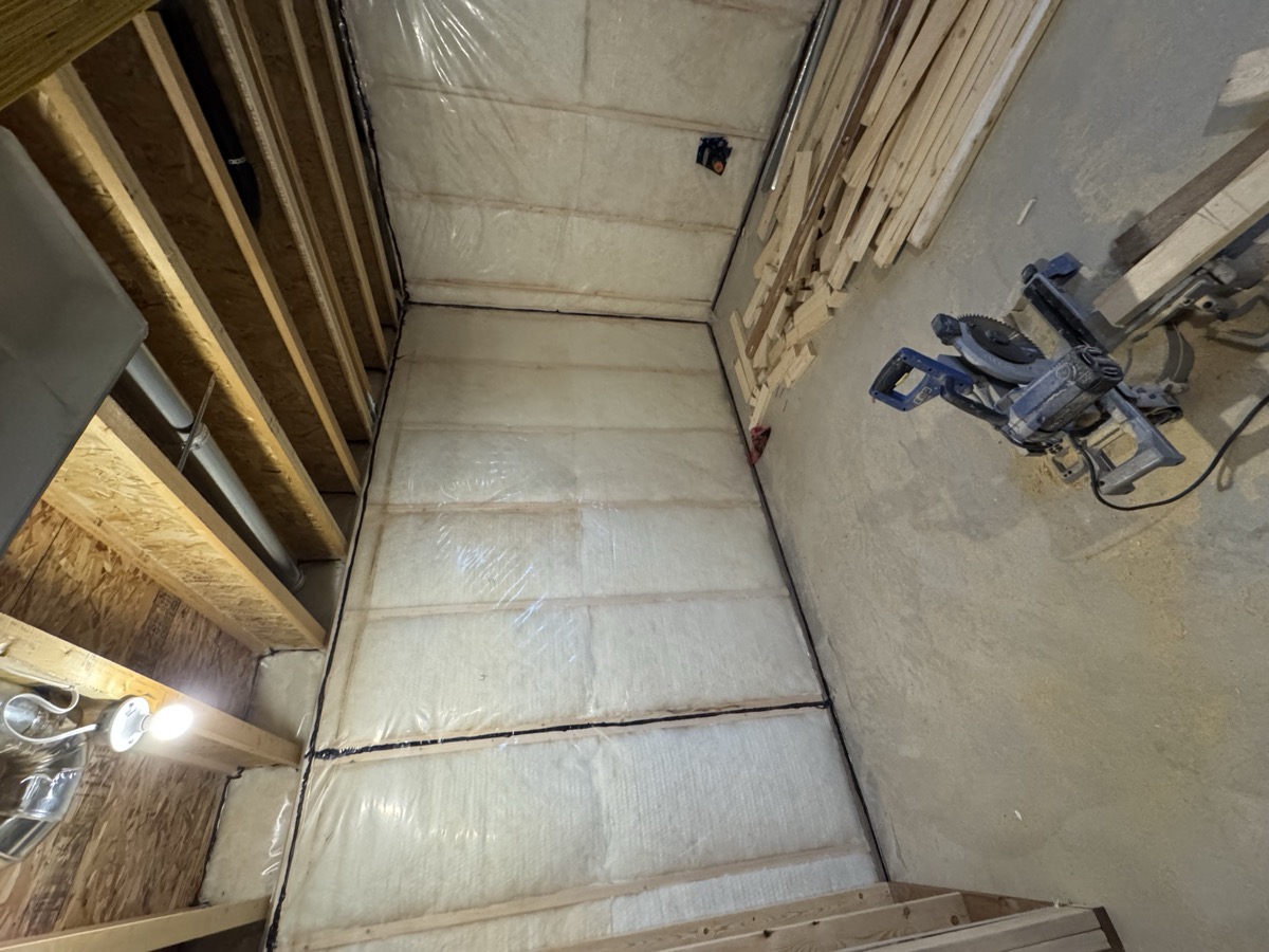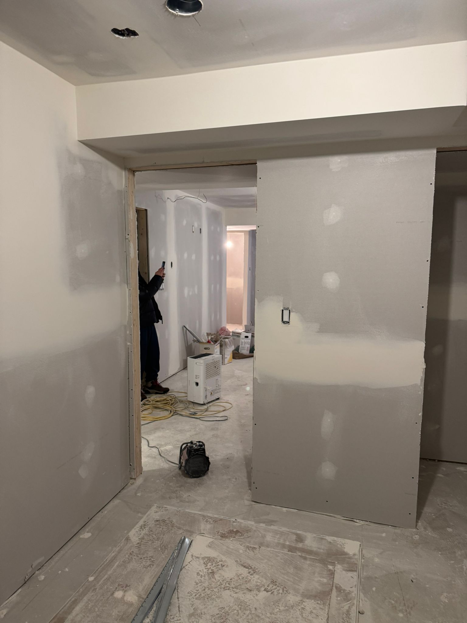 Once framing passed inspection and all rough-ins were complete, drywall went up throughout the suite. Walls were taped, mudded, and sanded smooth. Recessed lighting was installed in every room. The stairwell for the separate entrance also took shape during this phase.