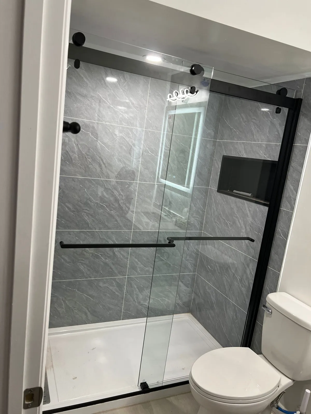 Serge wanted a space that felt like a hotel spa: clean lines, dark accents against light walls, and modern fixtures that made the bathroom feel intentional rather than an afterthought. We designed around three anchor elements — a frameless sliding glass shower with matte black hardware, large-format stone-look tile, and a backlit LED smart mirror — that would set the tone for the entire room.